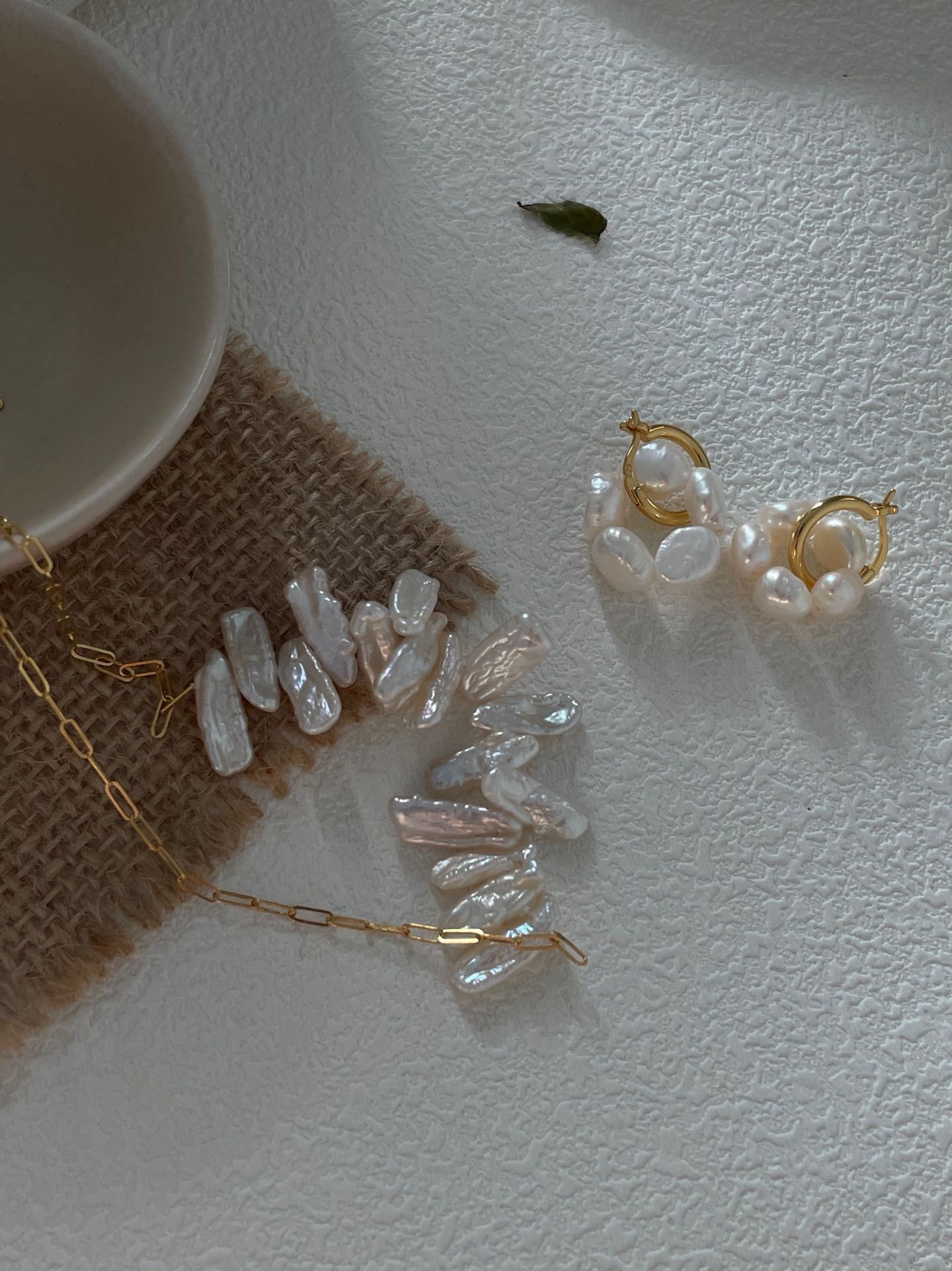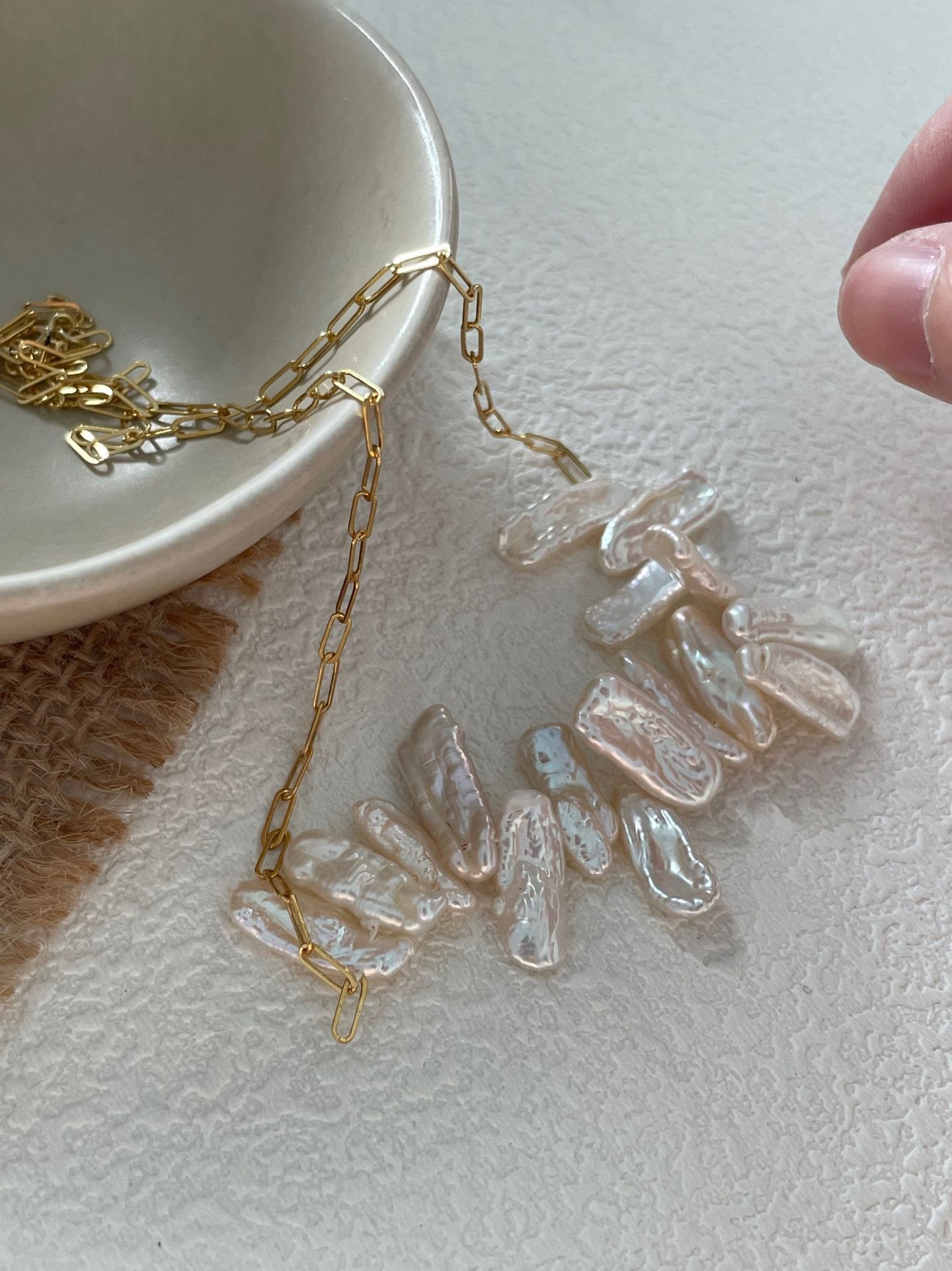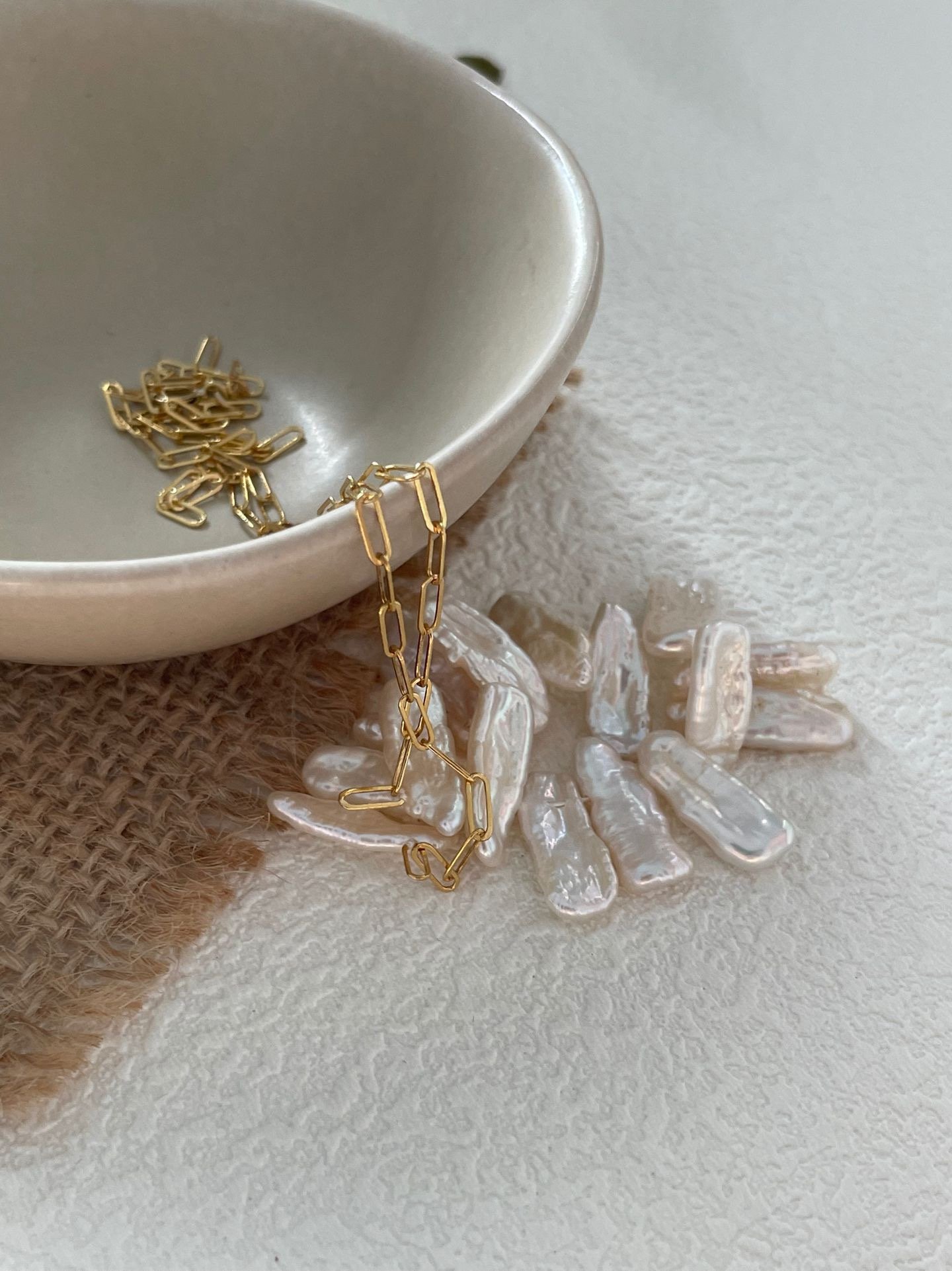 This necklace features shaped pearls that create a unique ‘smile’ curve, with the irregular shape of each pearl lending a sense of artistry to the piece. The 14K gold-filled chain and the organic lines of the pearls create a poetic collision of modernity and nature, and the overall design resembles a miniature sculptural work of art, while adding a sense of sophistication to everyday wear.