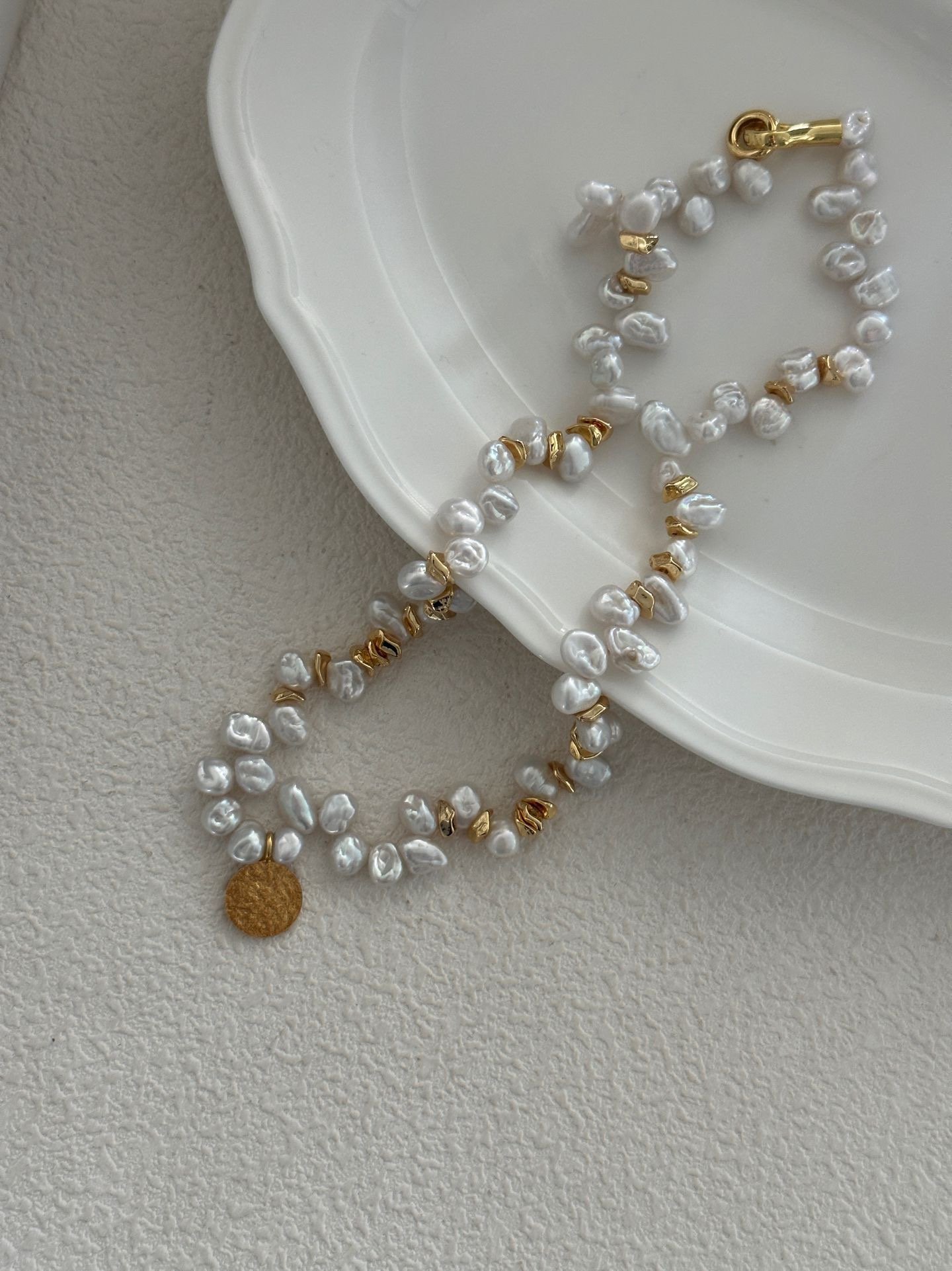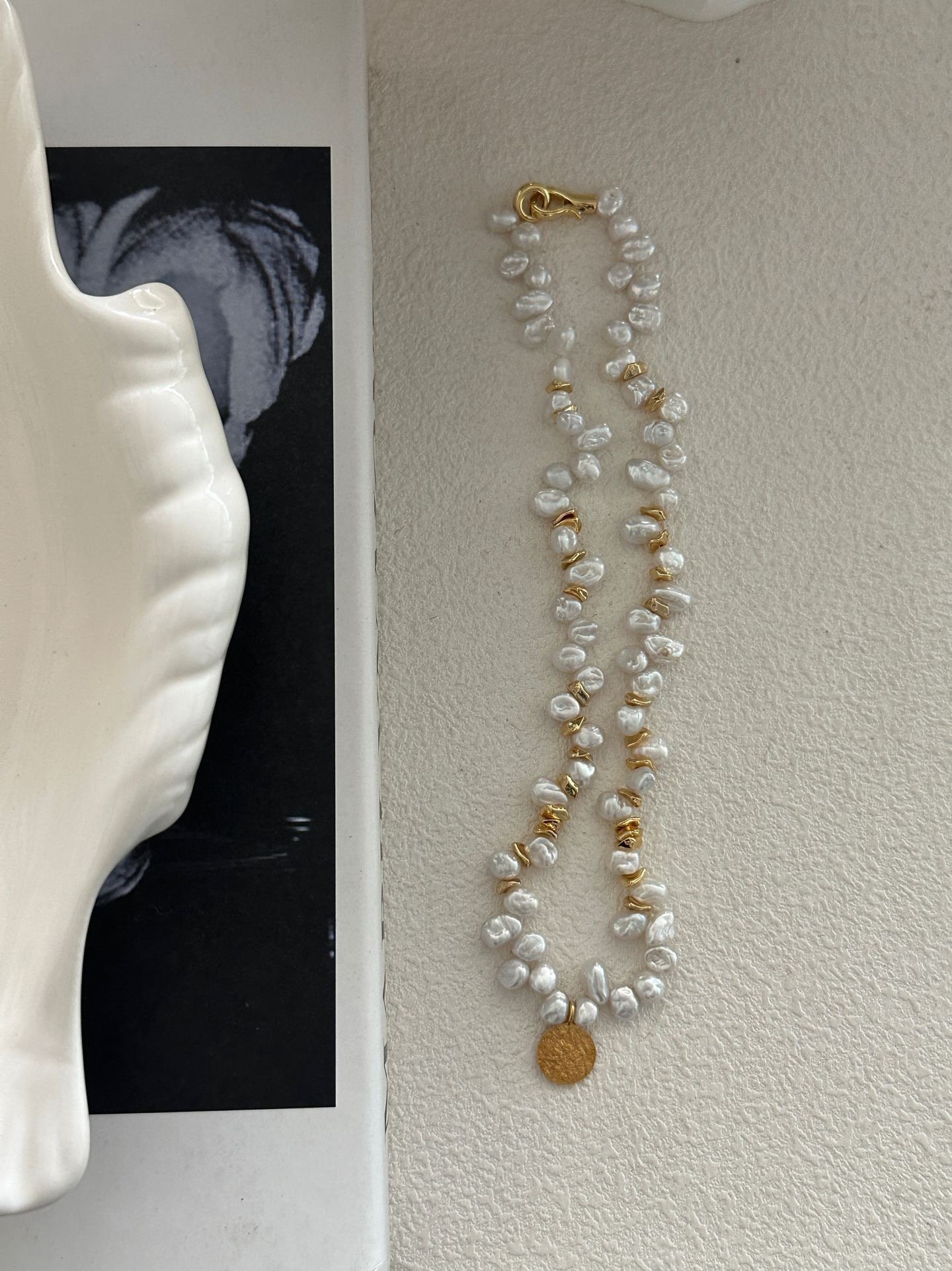 This necklace is a clever blend of keshi pearls and gold-plated elements, with the wild beauty of irregular keshi pearls and the modernity of delicate gold medals, colliding to create a unique artistic atmosphere. The whole has a natural and dynamic vitality without losing the urban modern style.