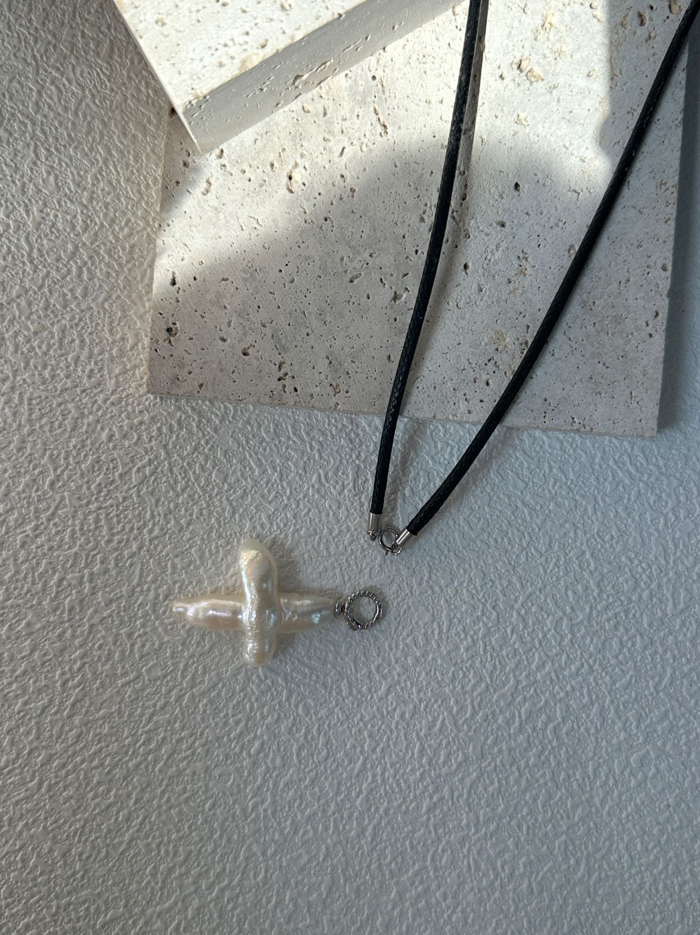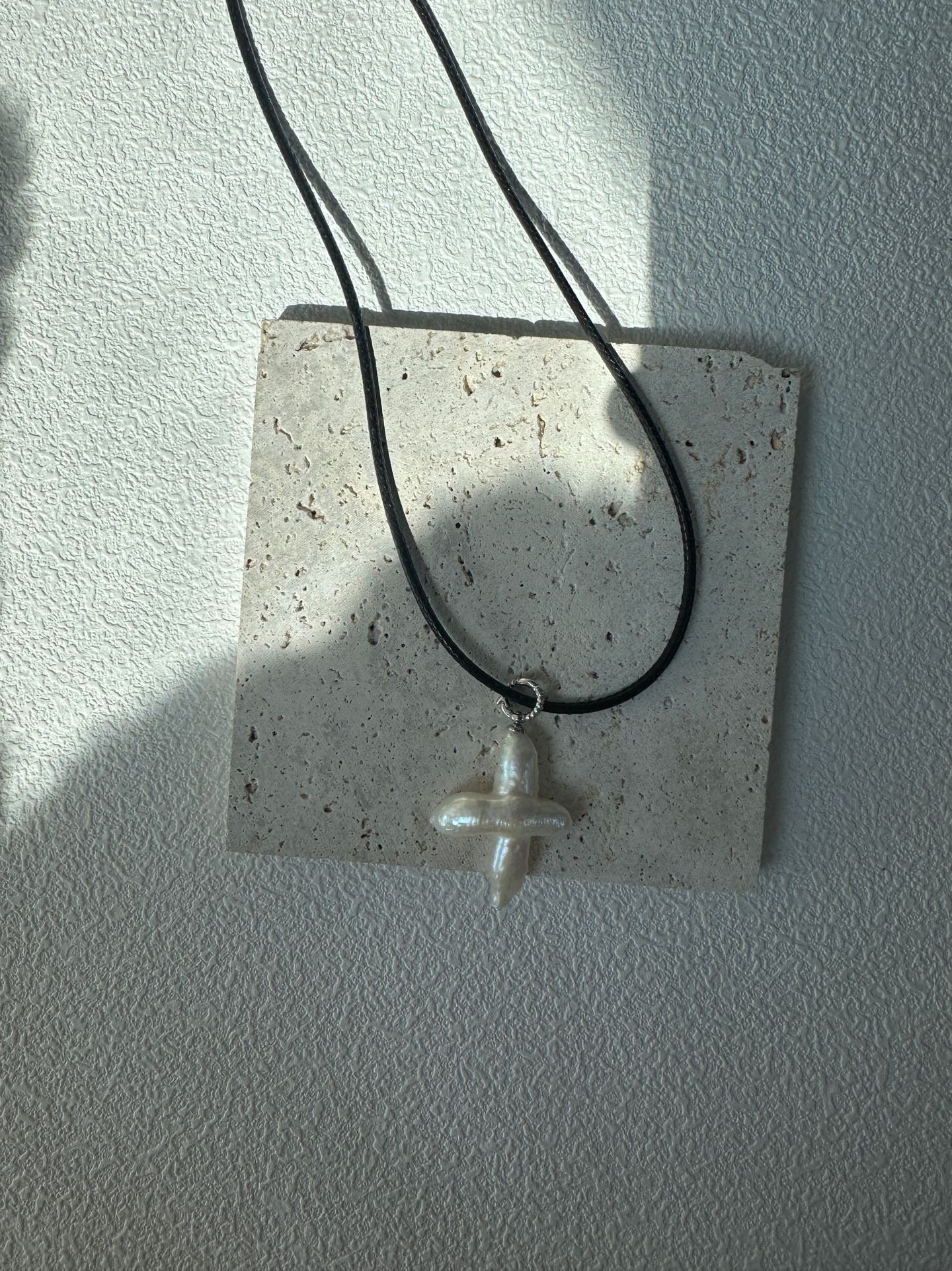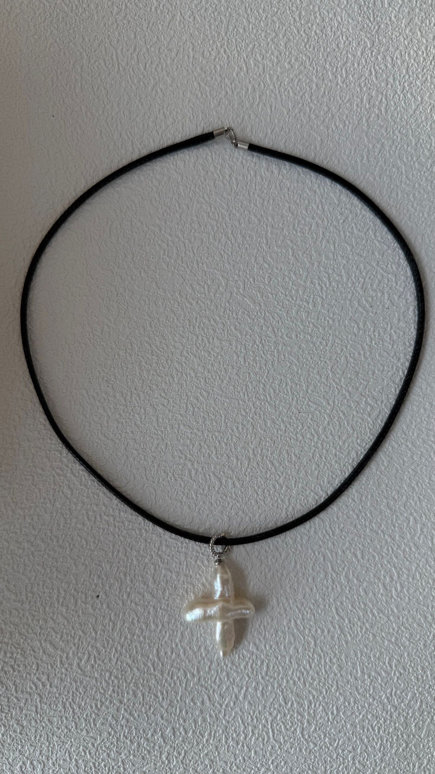 – Item No.:678-Cross Pearl Leather String Necklace