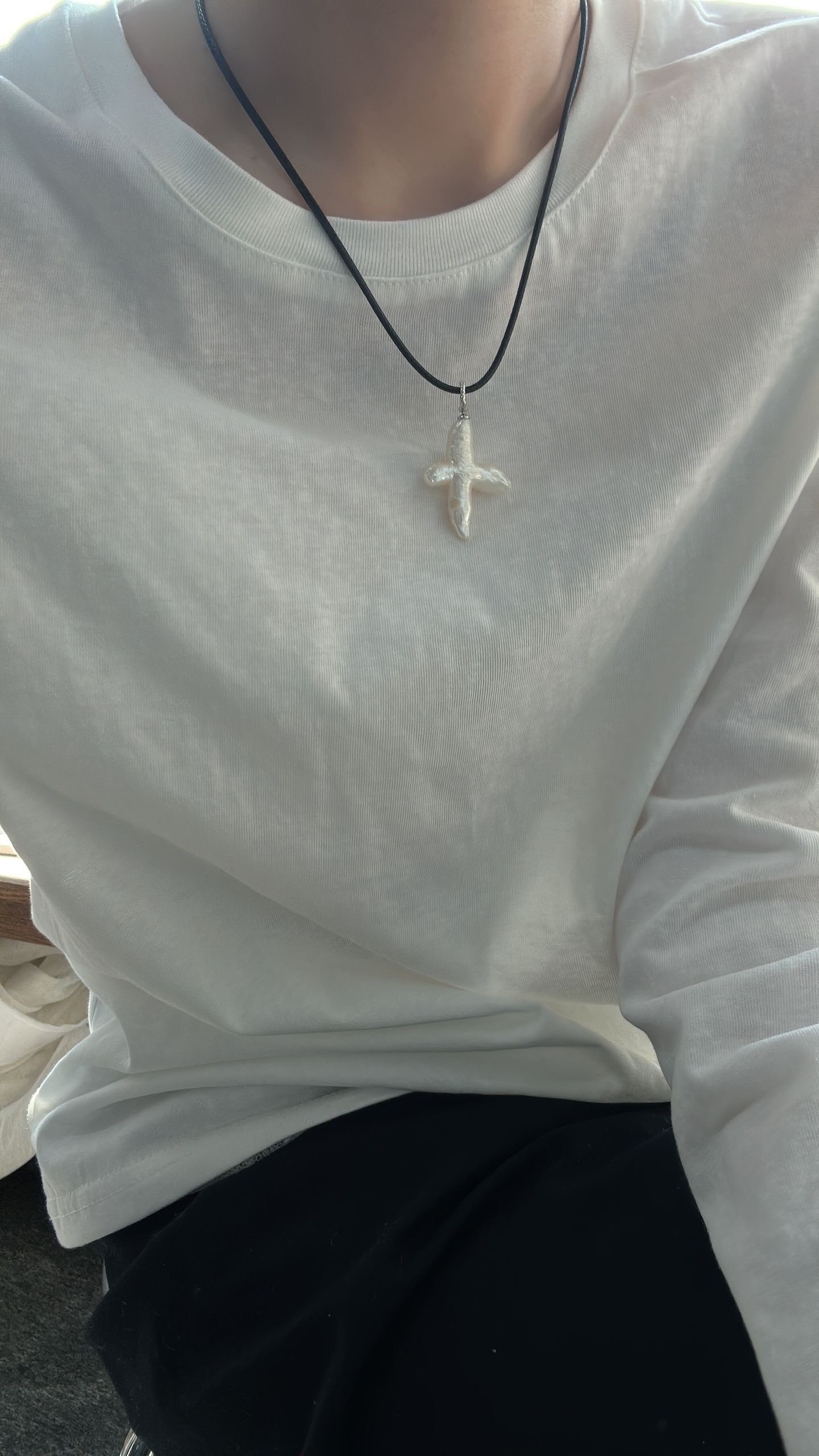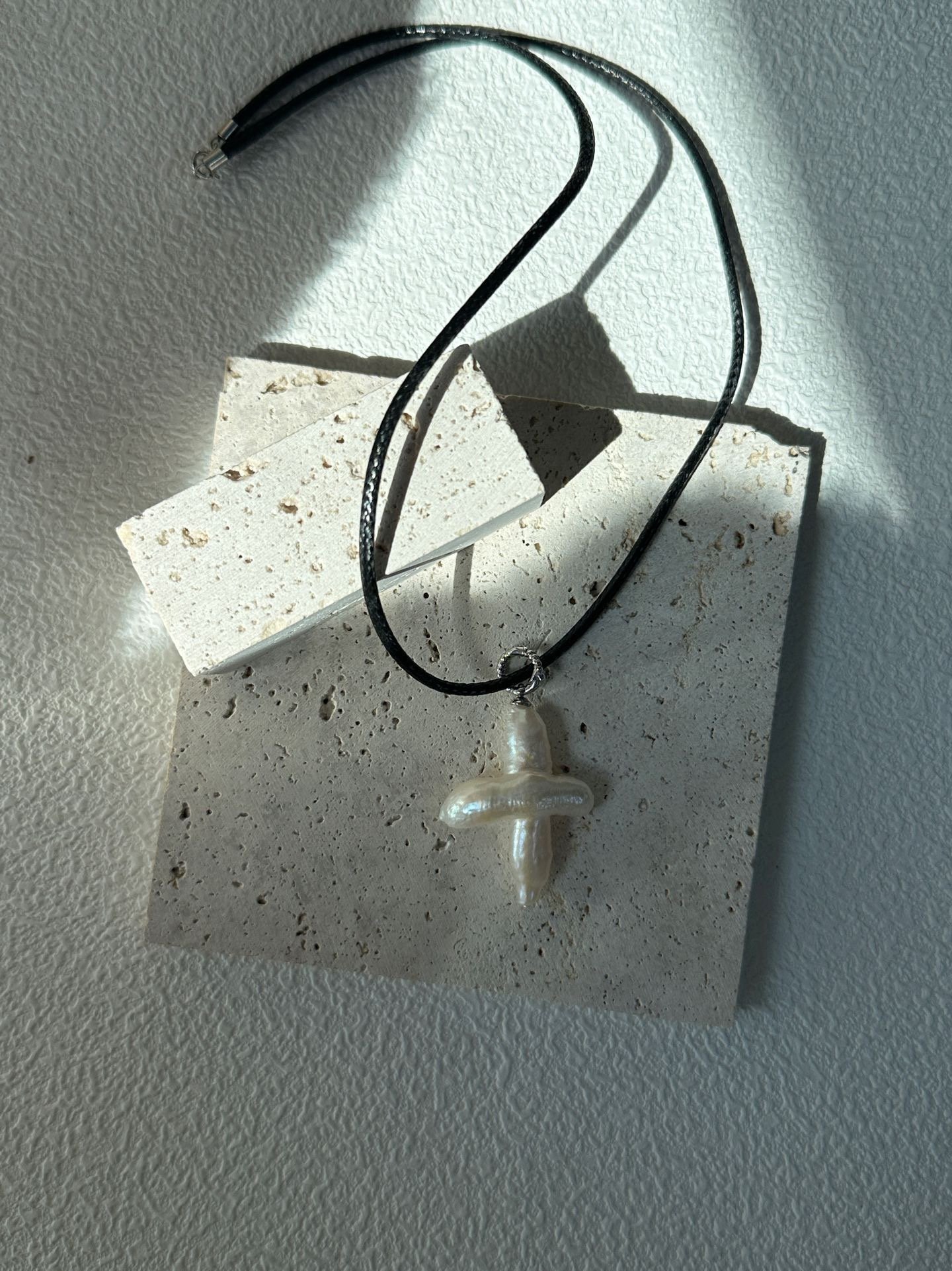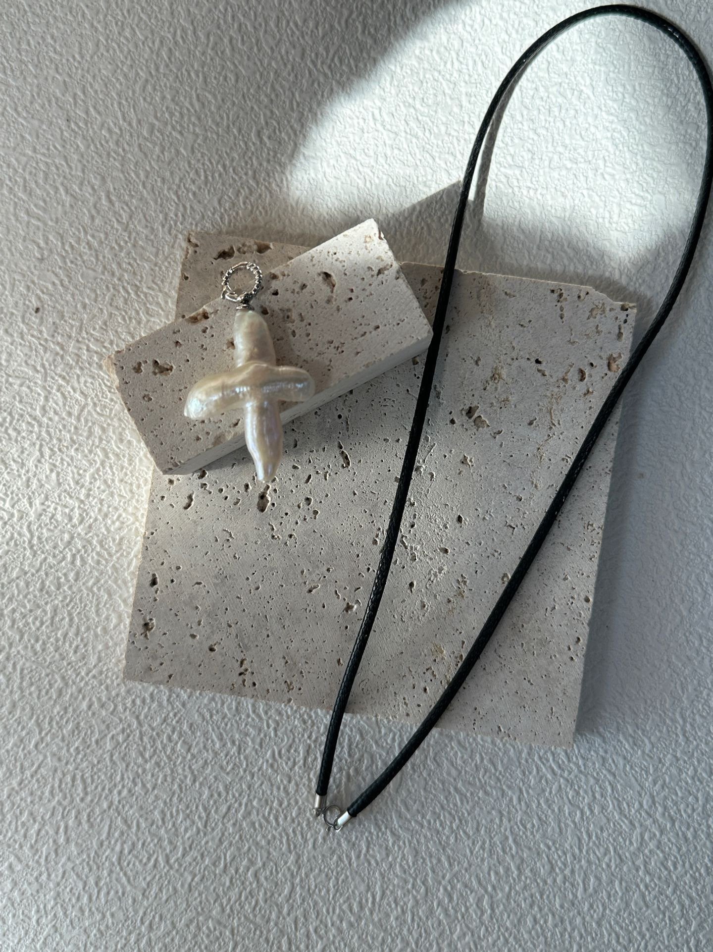– Item No.:678-Cross Pearl Leather String Necklace