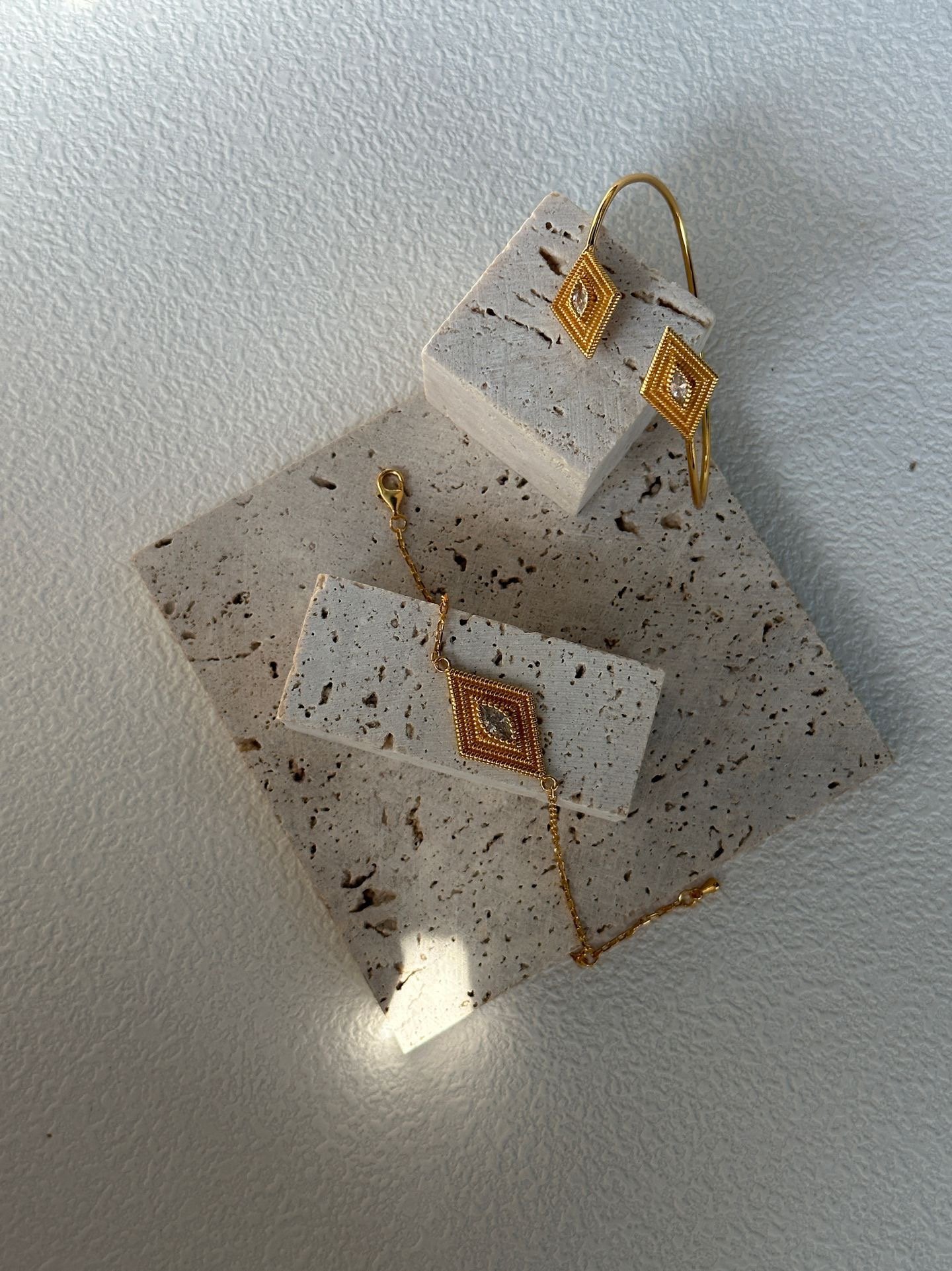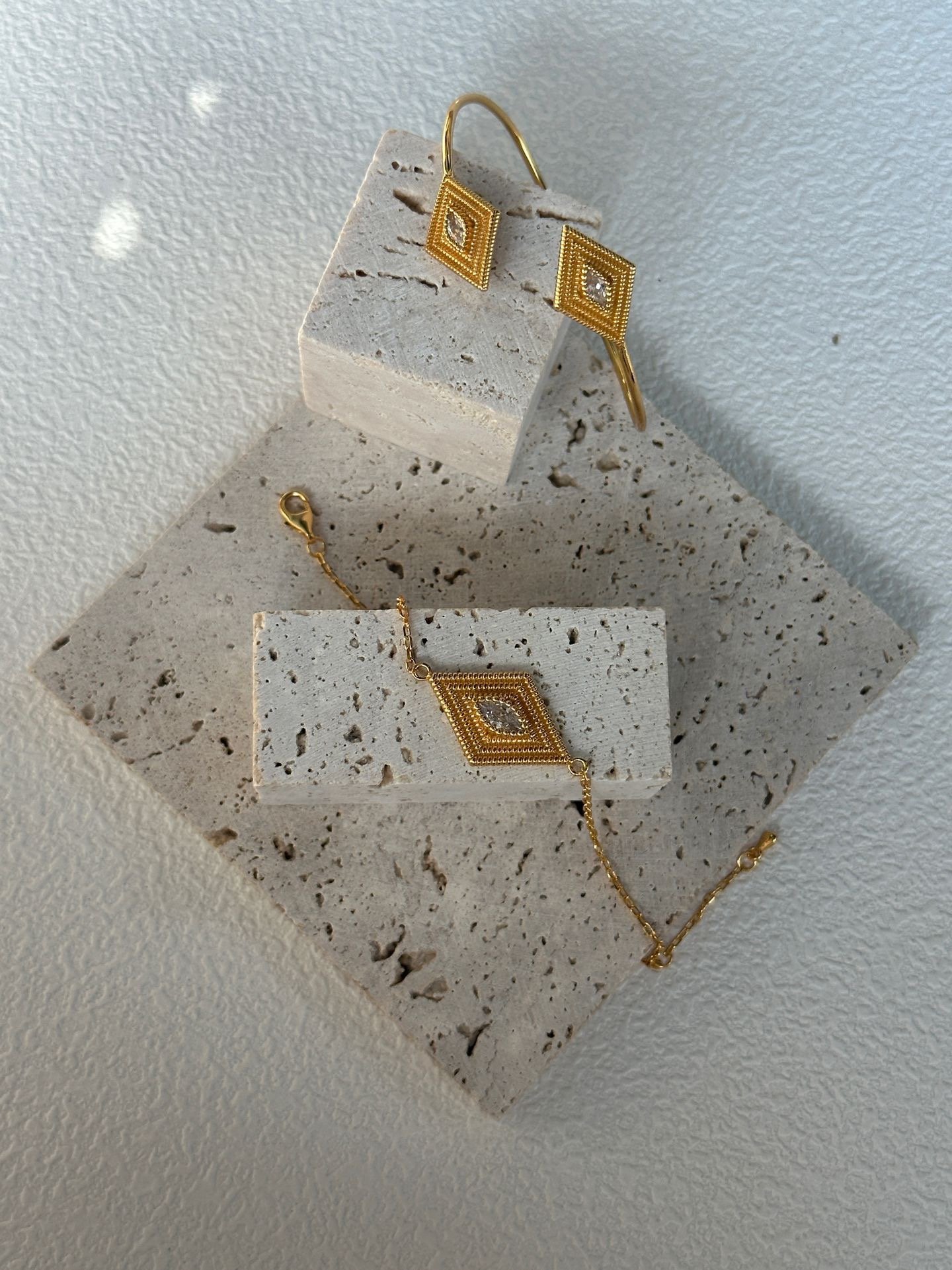 – Item No.:689-Greek Eye Bracelet – Length: chain length – Material Description: Metal parts: silver plated with gold 18K Other parts: zirconia